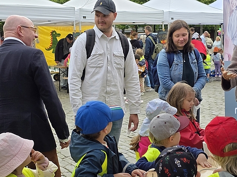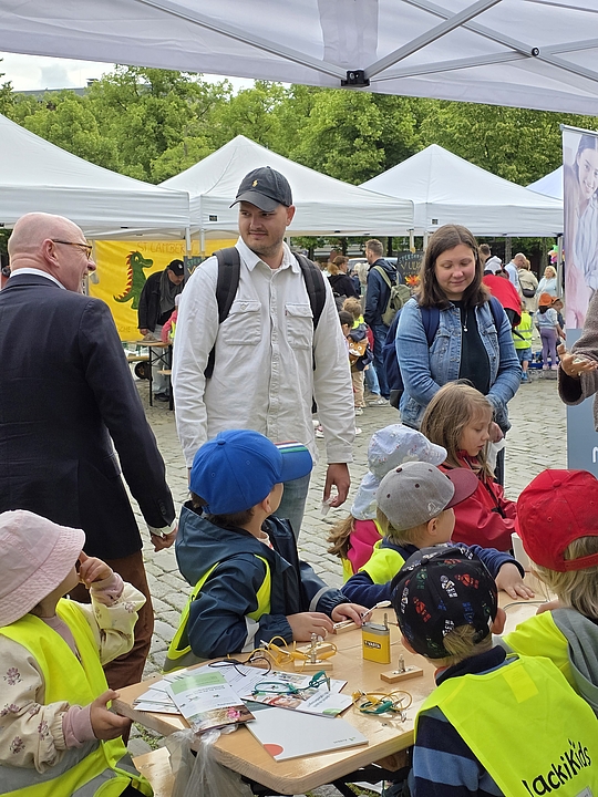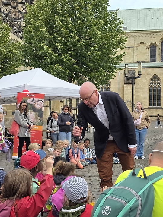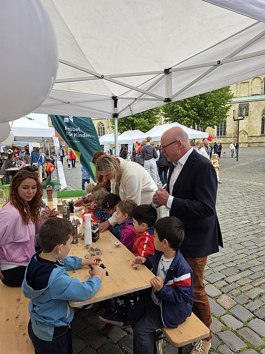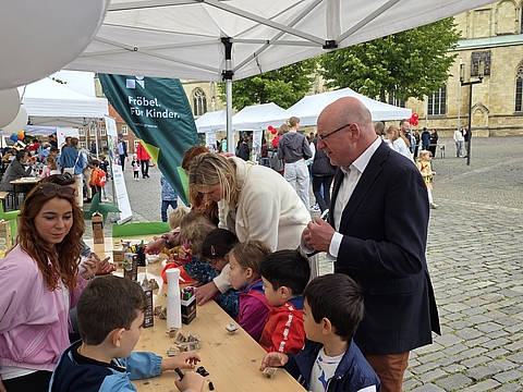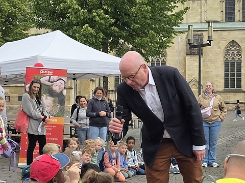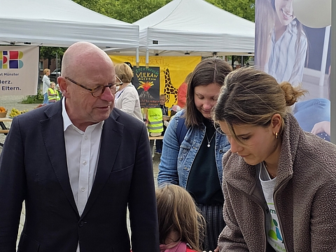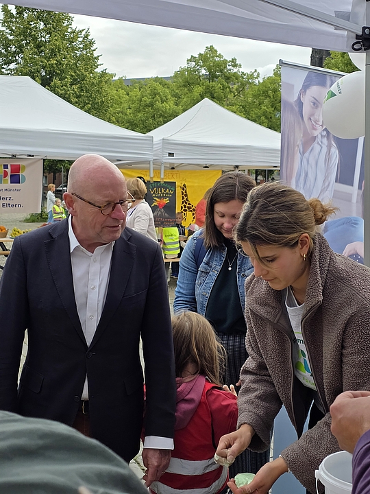 Oberbürgermeister Markus Lewe eröffnete die im Verbund Münsteraner Kindertagesstätten, den sozialpädagogischen Fachschulen und der Regionalstelle Münster organisierte Veranstaltung. Vom Einsatz der kleinen und großen Bildungsakteure zeigte er sich begeistert und sagte: „Kinder sollen die Welt mit offenen Augen selbst entdecken können. Neben der Freude am Forschen und Entdecken geht es bei einer guten frühen MINT-Bildung aber auch um Offenheit und Gleichberechtigung, und ich freue mich, dass wir „Münster forscht!“ bereits zum dritten Mal auf dem Domplatz anbieten.“