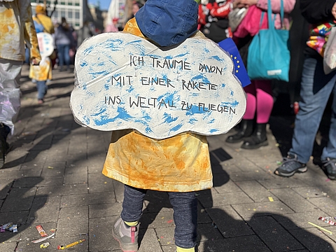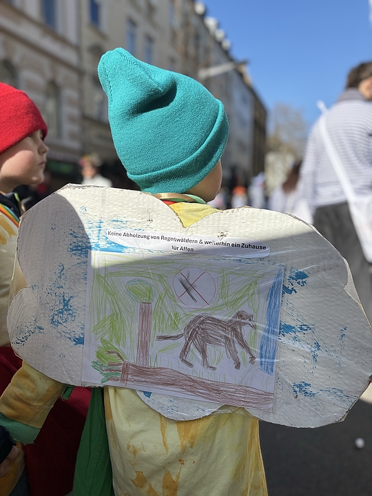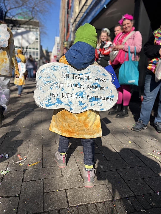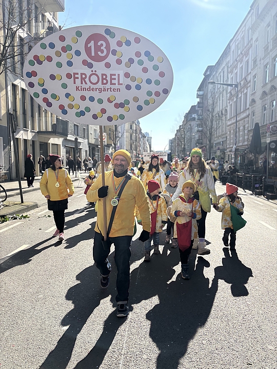 Mit selbst gebatikten T-Shirts, bunten Mützen und Traumwolken auf dem Rücken zogen die jungen Fröbel-Jecken durch die Stadt. Unter dem Motto „Uns Pänz dräume: de Welt weed jlöcklich un bunt. Kumm, maach met!“ (Kölsch für: „Unsere Kinder träumen: Die Welt wird glücklich und bunt. Komm, mach mit!“) wurde gefeiert, getanzt und gleichzeitig ein Zeichen für Vielfalt, Frieden und Inklusion gesetzt. Die bunten Traumwolken aus Pappe auf den Rücken der Kinder symbolisieren nicht nur die Fantasie der Kinder, sondern auch ihre Hoffnungen und Träume für eine Welt, in der Vielfalt, Zusammenhalt und Nachhaltigkeit gelebt werden. Unter anderem äußerten die Kinder Wünsche wie: „Keine Abholzung der Regenwälder, damit Affen weiterhin ein Zuhause haben“ oder „Ich wünsche mir, dass es allen Tieren gut geht.“