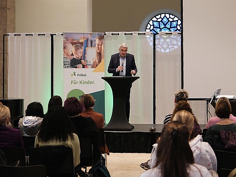 NRW-Familienstaatsekretär Lorenz Bahr eröffnete den Fachtag und setzte gleich zu Beginn eine klare Botschaft: „Sprache ist der Schlüssel zu Bildung, gesellschaftlicher Teilhabe und Integration. Wir setzen bewusst auf alltagsintegrierte Sprachbildung in Kitas, um alle Kinder zu erreichen. Dabei geht es nicht nur um die Förderung der deutschen Sprache, sondern auch um die aktive Einbindung von Mehrsprachigkeit.“ Daran knüpfte Fröbel-Geschäftsführer Stefan Spieker direkt an und betonte, dass gute Sprachbildung der Schlüssel für eine gelingende Bildungsbiografie sei – unabhängig von Herkunftssprache und sozialem Umfeld: „Wir wollen alle Kinder vom ersten Kita-Tag an in die Lage versetzen, sicher in die Schule zu starten“.