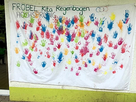 Im Fröbel-Kindergarten Regenbogen entstand sogar eine „Wall of fame“, bei der sich alle kleinen Athletinnen und Athleten mit einem Handabdruck nach absolvierter Sporteinheit verewigen konnten.