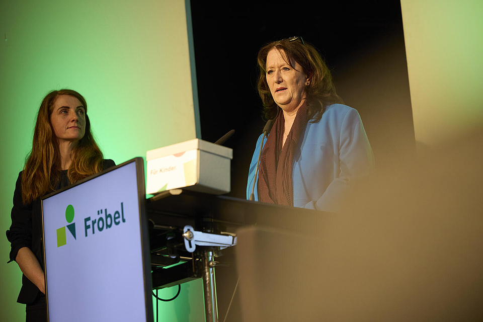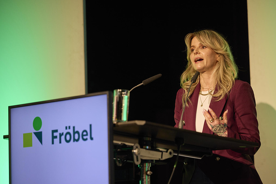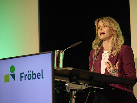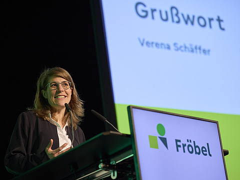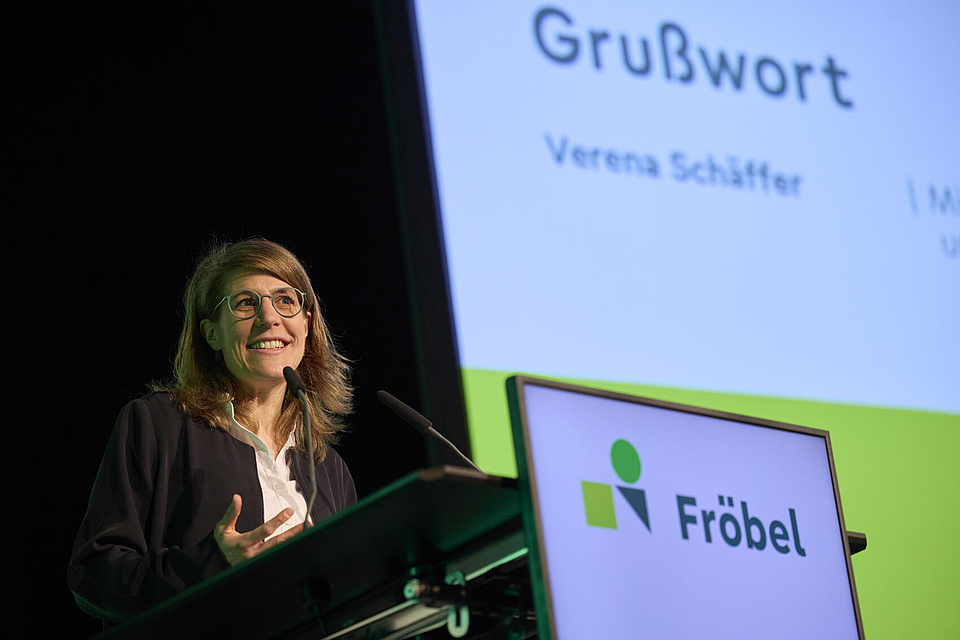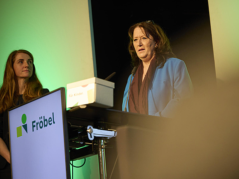 Zu Gast war auch die nordrhein-westfälische Familienministerin Verena Schäffer, die sich in einem politischen Dialog mit Fröbel-Geschäftsführer Stefan Spieker zu aktuellen bildungspolitischen Entwicklungen äußerte – darunter die Reform des Kinderbildungsgesetzes (KiBiz) sowie die geplante Einführung sogenannter „ABC-Klassen“ an Grundschulen.